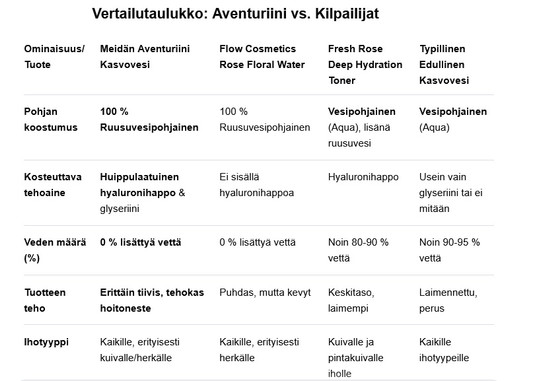 - Ylellinen pohja: Ruusuvesi on huomattavasti kalliimpi pohja kuin puhdistettu vesi. Tämä asettaa tuotteen luksus- ja luonnonkosmetiikan kategoriaan.